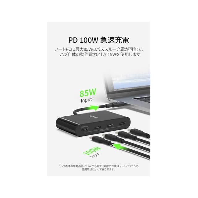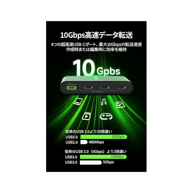 【4つのUSB-Cポートを搭載、10Gbps高速データ転送】カメラやキーボード、マウス、SSDなど4つのポートを使って様々なデバイスと接続。4 つの USB-C 3.2 Gen2 ポート。そのうち1基はUSB-C 100W PDに対応(USBハブで15W使用し、ホストへは 85W PD給電)。また、最大10Gbpsの高速データ転送対応で、ゲームやストリーミング、大容量データの転送など様々な用途に活用できます。