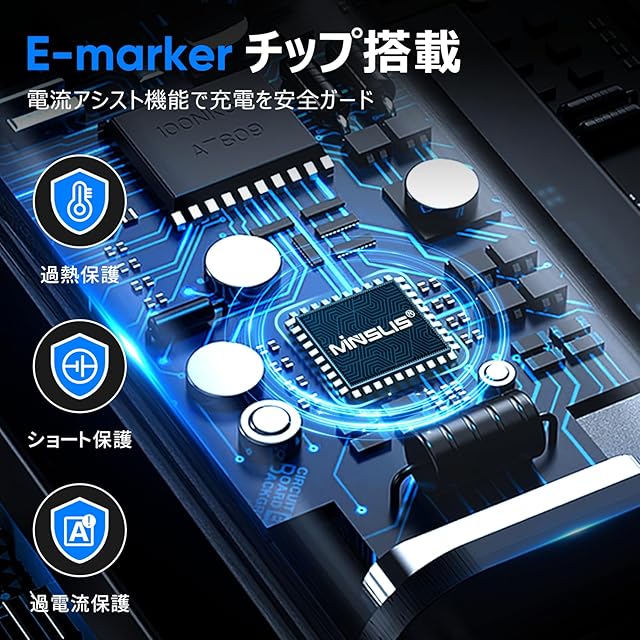 【E-markerチップ搭載】E-markerスマートチップ搭載により、5A大電流への対応と三重安全防御を実現:過充電を0.1秒単位の電圧監視でブロックし、短絡をマイクロ秒級電流制御で遮断、発熱は基板内蔵サーミスターによる85℃超防止で抑制。これらを統合的に作用させることで高安定性の急速充電をします。