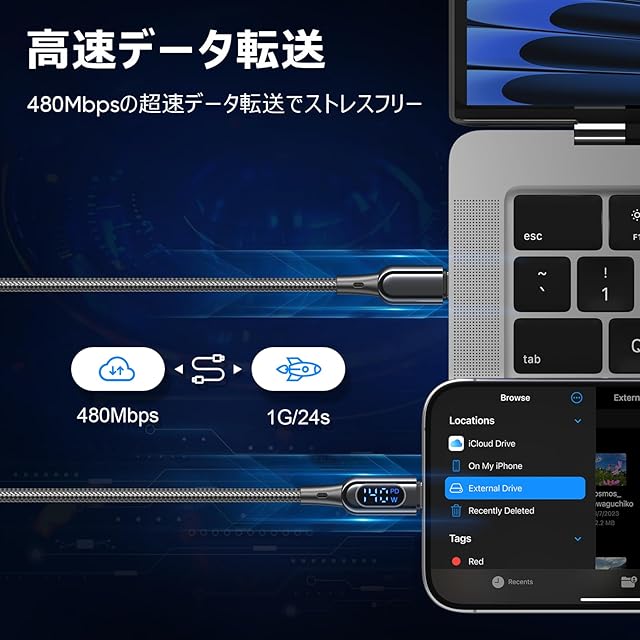 【高速データ転送】USB 2.0規格準拠で実用最大480Mbpsを実現し、スマホ・タブレット・ゲーム機など全USB-C端末における充電&通信の並行処理を可能にするとともに、充電中でもデータ転送遅延ゼロを維持し、写真/動画の大量転送高速化を実現します。▲映像出力非対応