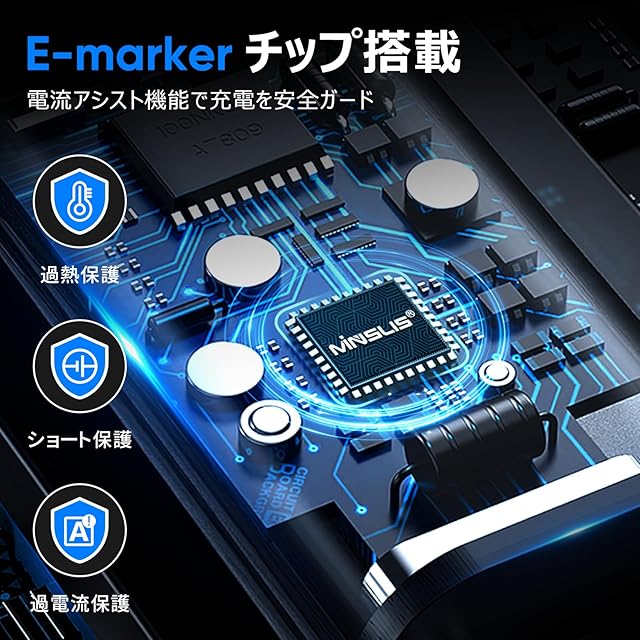 【E-markerチップ搭載】E-markerスマートチップ搭載により、5A大電流への対応と三重安全防御を実現:過充電を0.1秒単位の電圧監視でブロックし、短絡をマイクロ秒級電流制御で遮断、発熱は基板内蔵サーミスターによる85℃超防止で抑制。これらを統合的に作用させることで高安定性の急速充電をします。