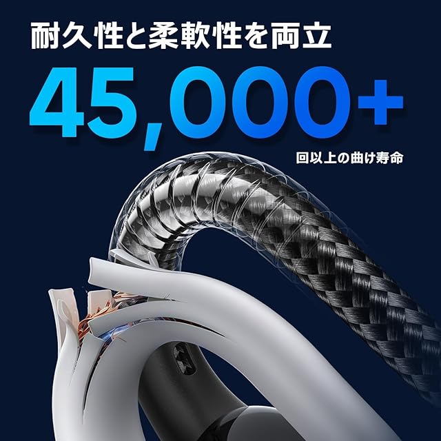 【耐久性と柔軟性の工学融合】高密度ナイロン編組ケーブルが厳格な折曲げ試験を突破し、φ4.2mmの極細径設計で柔軟性と強度を両立。Type-C端子の強化メッキ処理により断線リスクを大幅に低減し、従来品比で数倍の耐久性を実現した高寿命Type-Cケーブルです。