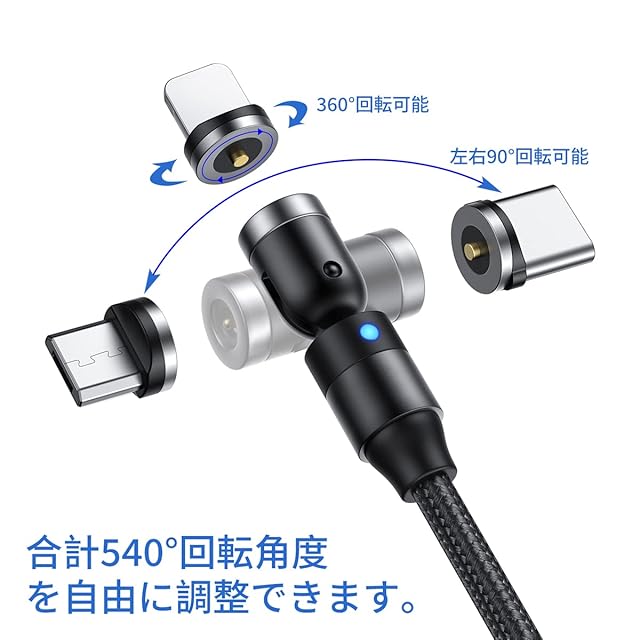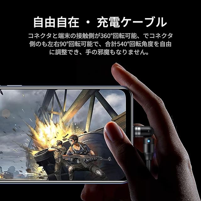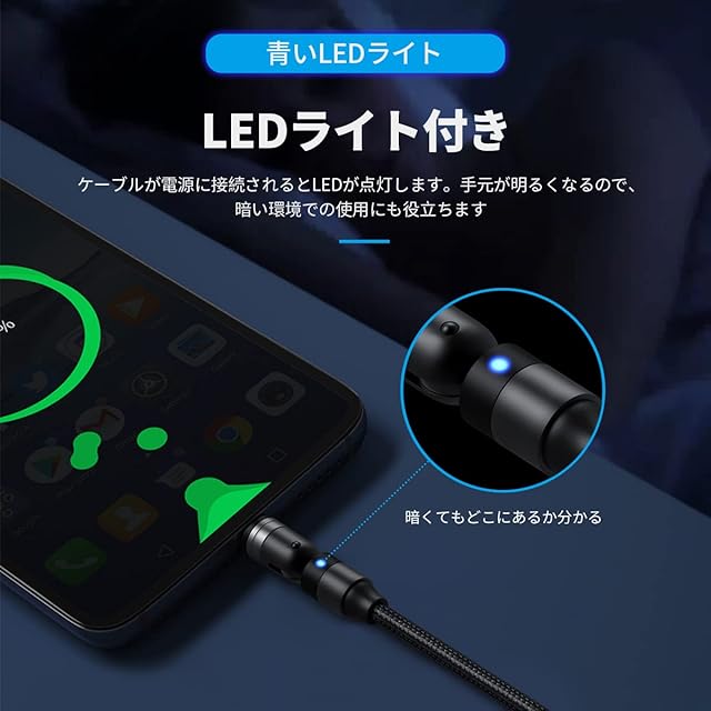 【180°+360°回転&LDEランプ】180°+360°回転デザインを採用し、充電の角度を自由に調整できます。充電しながらゲームをしたり、動画を見たりする際、コネクタの接続部分が邪魔にならず、快適に楽しめます。充電する時、LEDランプが点灯するので、真夜中でもスマホを見つけやすいです。