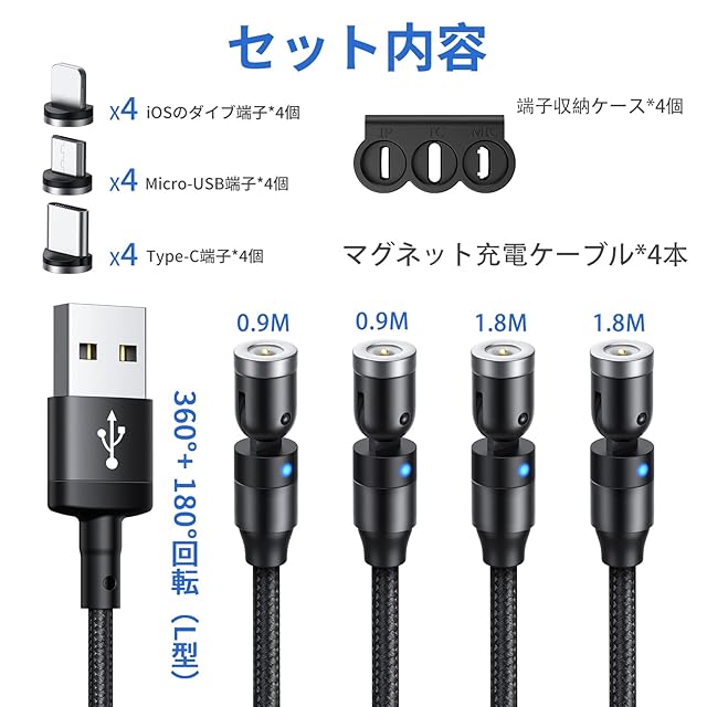 【4本セット& 12個端子】マグネットケーブルセット内容:マグネット充電ケーブル*4本+MicroUSB端子*4個+TypeC端子*4個+IOS端子*4個+端末収納ケース*4個。一年の期間に新品交換と対応いたします。万が一ご個別商品は物流などの原因で不良になる場合には、何かご質問やご意見があったら、下記の方法でご連絡ください。※連絡:商品詳細ページの「販売元」をクリック―店舗ページ右の黄色「質問する」をクリックして、連絡してください。