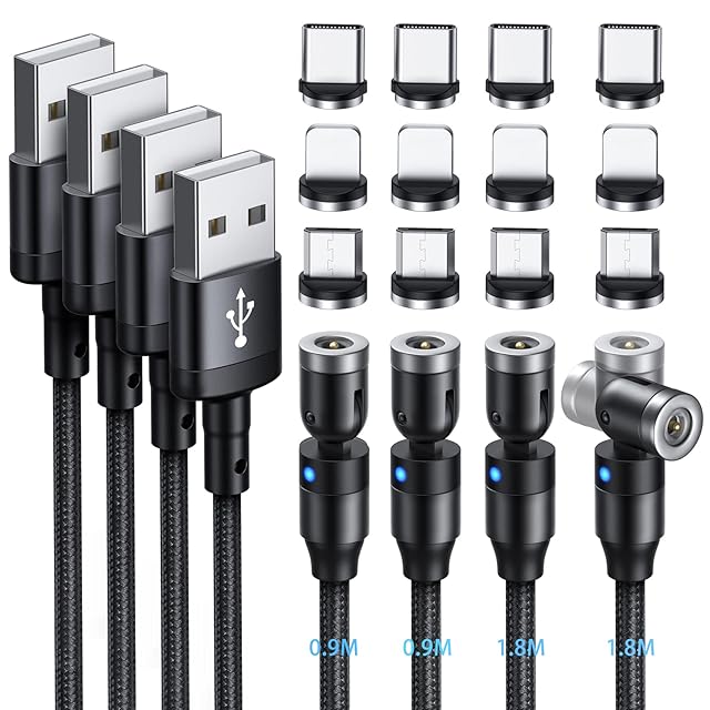 マグネット 充電ケーブル SUNTAIHO 3in1 USBケーブル【4本セット】360°+180°回転可能 磁石 磁気 防塵 着脱式 マイクロUSB Type-C コネクタ タイプc Micro USB Cable(0.9M+0.9M+1.8M+1.8M / ブラック)- TZD04 | つむぎ屋
