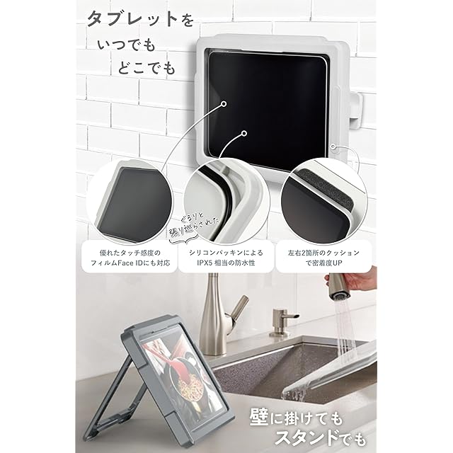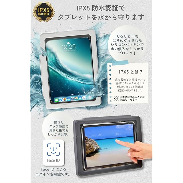 ✅優れた防水性能で水回りでのタブレットの使用も安心安全です。ぐるりと一周はりめぐらされたシリコンパッキンによって、IPX5相当の防水機能を有し、お風呂はもちろん、キッチンやプールサイドなどでもタブレットをお使いいただけます。IPX5とは「水を最低3分間注水する条件であらゆる方向から噴流を当てても機器の機能が動作すること」を意味します。※水中に沈めることはお控えください。