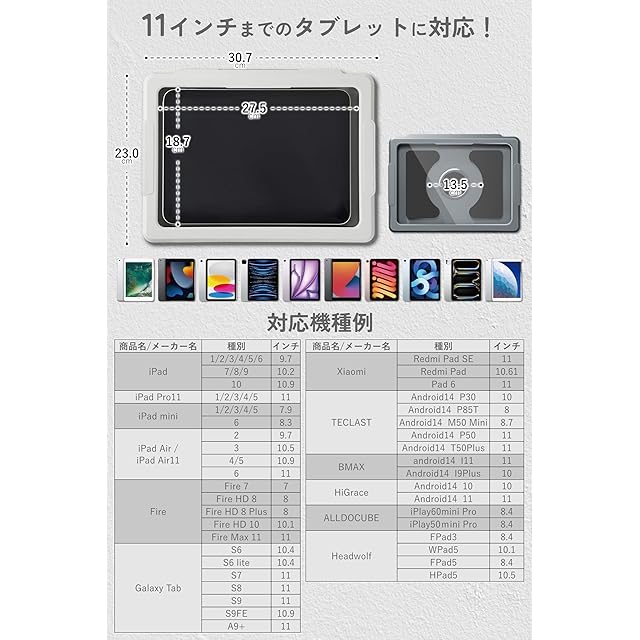 ✅11インチまでのすべてのタブレットに対応しており、強度の高い壁掛け用のシールが本体をしっかり支えます。取り付けは簡単3STEP。1.壁を乾いたタオルでキレイに拭く。2.壁掛け用のシールを貼る。3.シールに施されている2つの突起に対してアームを差し込み完成。※しっかり取り付けられているか確認するために2時間程度そのまま放置することをお勧めします。