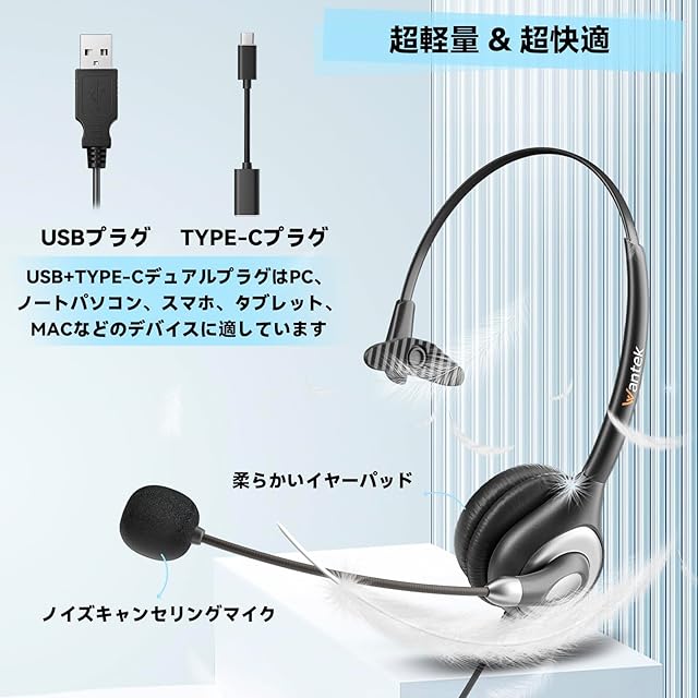 WantekヘッドセットUSB Type-C 片耳 ノイズキャンセリングマイク付き 音量調節コントローラー有線PC用ヘッドホン Web会議、Skype、オフィス、在宅勤務、業務用、リモートワーク、オンライン授業、コールセンターに適用 クリアな通話 超軽量 超快適 【適格請求書発行対象】 | つむぎ屋