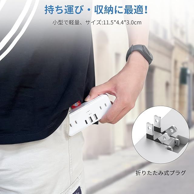 「コンパクト」本体サイズ11.6*4.5*3CMの小型の設計で、持ち運びに便利です。家に使っても目立つもないコンパクトな電源タップです。
