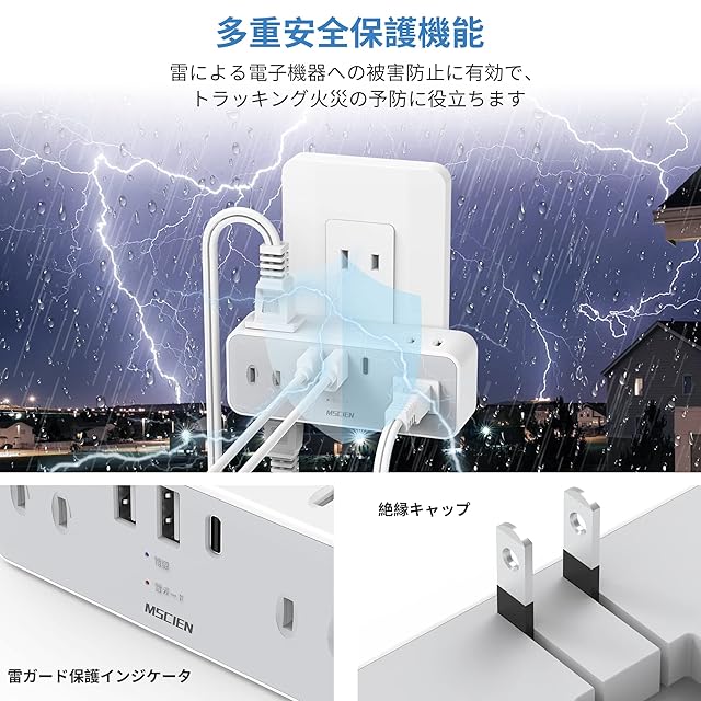 「雷ガード」雷ガードを内蔵しており、雷サージによる家電の故障を効果的に防ぐことができます。