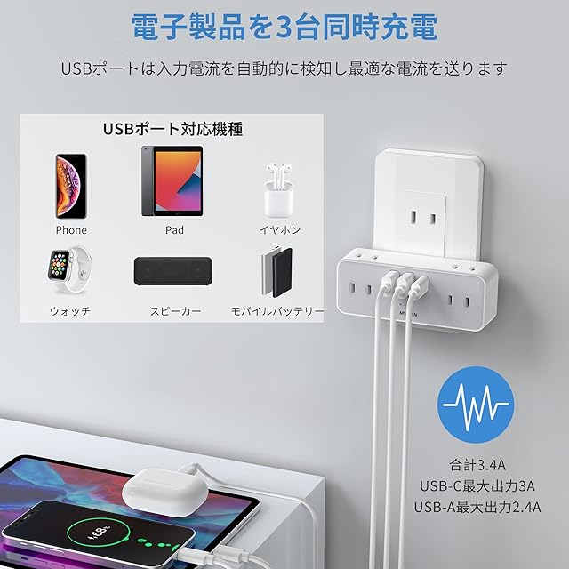 【コンセント usb】各USBポート合計3.4A出力。type-aポート単独で使用する場合、最大出力2.4A。type-cポート単独で使用する場合、最大出力3A。USBポートには接続機器の端末を自動で判別し、スマホとカメラなど、それぞれの機器に合わせた最適な出力で充電します。