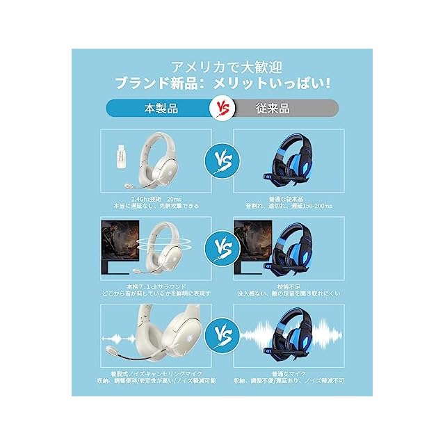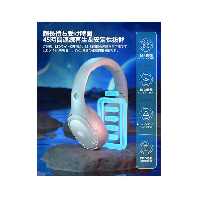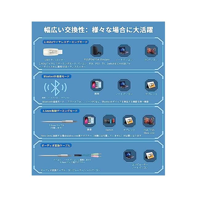 【2.4GHz /Bluetooth 5.3/有線3WAY接続& 45時間連続再生】■PCゲーム、スマホゲーム兼用できるために、USBトランスミッターやBluetooth 5.3、3.5mmオーディオケーブルを配備され,PC / ps5/ PS4 / Mac /スマホ/xbox /xboxone/Nintendo Switch/ノートなどの機種に対応できます。USB接続は普段bluetooth連接より、普段Bluetoothより通信速度x2倍、遅延≤20ms、安定性x5倍。PC / ps5/ PS4 / Mac /スマホ/xbox /xboxone/Nintendo Switch/ノートなどの機種に対応できます。フル充電後45時間ワイヤレス体験を楽しむことができます。LEDライトが点灯している場合は20時間連続使用可能。万が一商品を問題があるなら、ご遠慮なくご連絡ください。返品手続きなし、無料で新品交換か返金などのご対応をさせていただきます!