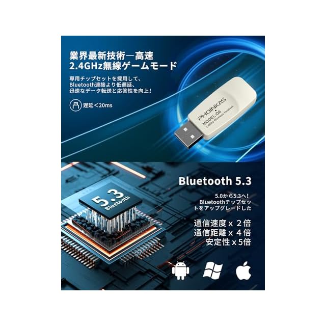 【大迫力なサラウンドサウンド】高精度 ・強磁力ネオジウムドライバーを採用して、高音響体験を実現したヘッドセットは、新たな次元を体験し、臨場感と没入感を追求する方に最適です。同時に一部の周波数帯域を再生することによる音の歪みが改善します。低音から高音まで、リアルなサウンドステージを提供し、臨場感が溢れる原音に忠実な再現するゲーミングヘッドセットを使って、ゲーム世界に没入できる体験をお届けされている。USB接続は普段bluetooth連接より、普段Bluetoothより通信速度x2倍、遅延≤20ms、安定性x5倍で、銃声、敵の足音など強い低音を立体的に再現して、周囲の音の位置や距離を正確に把握し、敵の位置・足音や環境音をしっかりと捉えることができ、的確に把握し、ゲームプレイを強化します。
