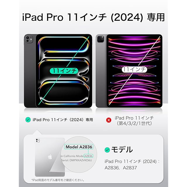 【互換性】:iPad Pro 11インチ M4(2024、第5世代)専用です。モデル:A2836、A2837。他のiPadモデルと互換性がありません。ご注意:iPad Pro 11 M2には適しておらず、M2モデルではレンズを遮る可能性があります。