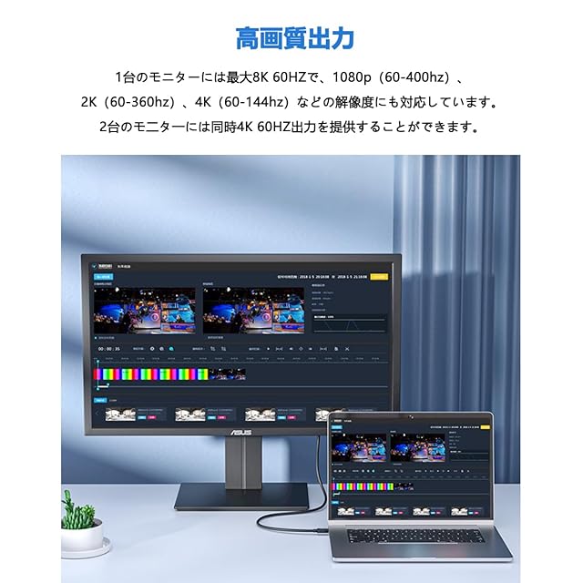 高画質出力:1台のモニターには最大8K 60HZで、2台のモニターには同時4K 60HZ出力を提供することができます。