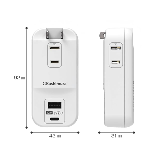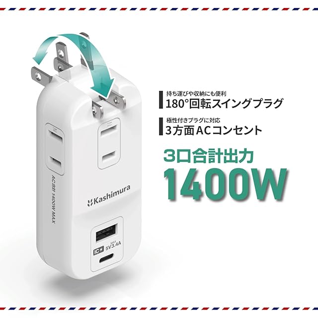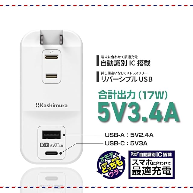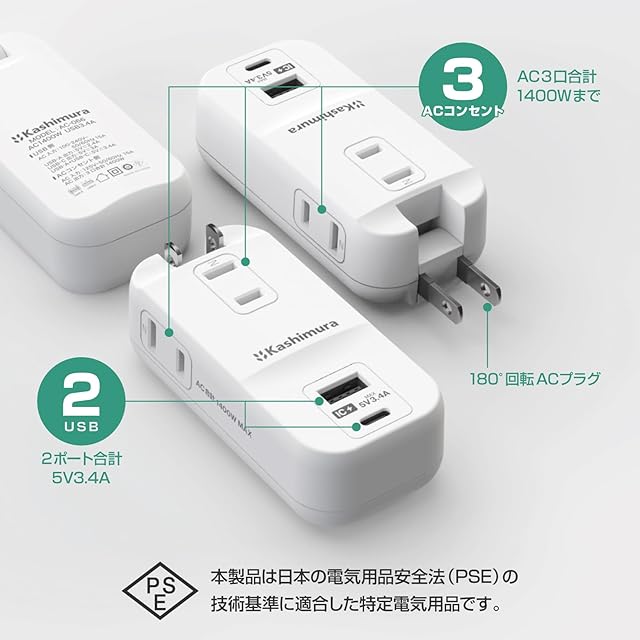 カシムラ 国内・海外両用電源タップ 100~240V入力対応 AC3 USBA+C 3.4A 自動識別 【ACコンセント3口合計1400W / USBポート2口合計最大出力17W (5V 3.4A)、USB-A×1(最大12W) 、 USB Type-C×1(最大15W)】 NWM-34 | つむぎ屋