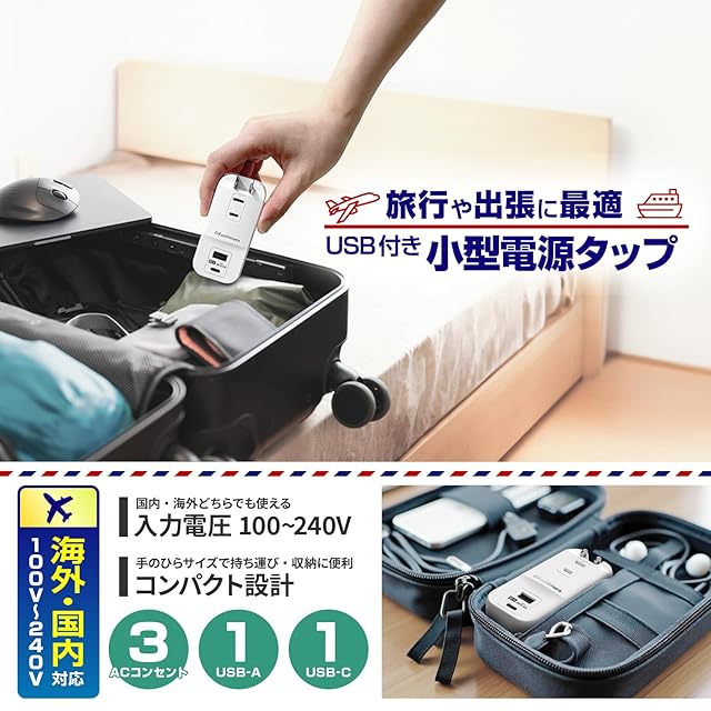 旅行や出張に最適。USB付き小型電源タップ。3口のACコンセントとUSB Type-Aポート+USB Type-Cポートを搭載。