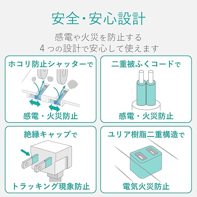 プラグの刃の根本に絶縁キャップが付いており、トラッキング現象による火災の防止に役立ちます。