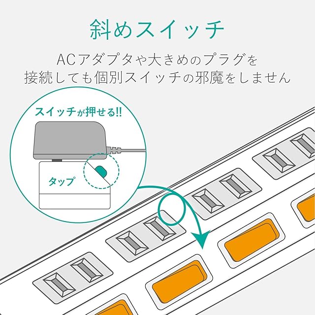 個別スイッチには、ACアダプターや大きめのプラグを接続してもスイッチに干渉しにくい、斜め配置のスイッチを採用しています。