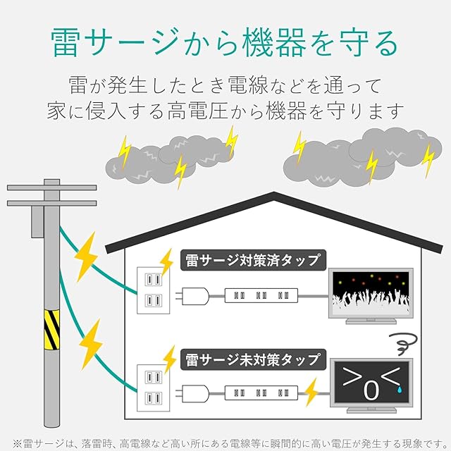 サージ電圧12500Vの高性能雷サージ吸収素子(バリスタ)を内蔵していますので、雷によるパソコンやAV機器などの電子機器への被害防止に有効です。 ※サージ電圧12500VはJEC210/212規格に基づく数値です。IEC61000-4-5規格ではサージ電圧は4500Vになります。