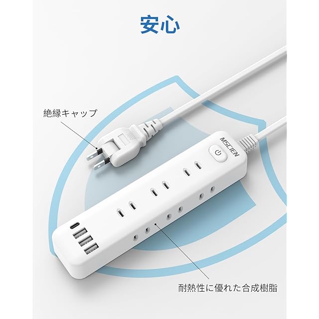 「安心」コンセントタップは耐熱性に優れた合成樹脂を採用しており、プラグには絶縁キャップが付いており、感電・火災の防止に有効です。