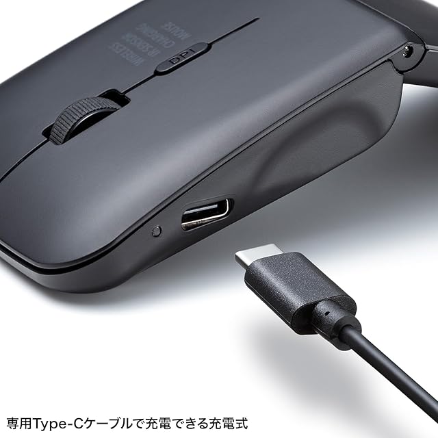 専用USBケーブルで充電できる充電式のワイヤレスマウスです。