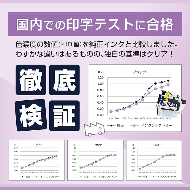 [製品の特長] ブラザー用 LC411 互換インクは、純正同量の印刷枚数を可能にしたICチップを搭載しています。日本製活性剤が配合されており、目詰まりの原因を軽減し写真紙になじみがよい高発色のインクを採用。保管時のことも考え、インクは各色個包装になっています。※本製品は純正品ではありません。純正品同様にご利用いただける互換インクカートリッジです。