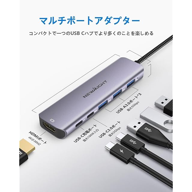 【6-in-1 usb ハブ マルチポート】typec ハブ 6-in-1は(4K HDMIポート*1、USB-C充電ポート*1、USB-Cポート(OTG)データ転送機能*1、USB-A 3.0ポート*3)があり、Newmight usb-c ハブはノートパソコンにUSB Cポートが1つしかない問題を完璧に解決し、USBポートに挿すだけですぐに使え、初めて使用する人でも安心使用できるusbハブ type cです。(ご注意:購入前に、type-Cポートが充電、ビデオ出力、データ転送に対しているかご確認お願い致します)