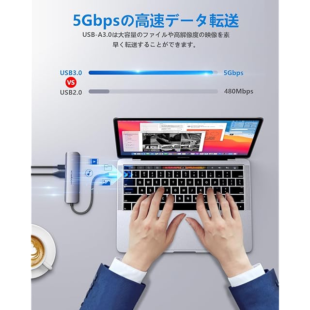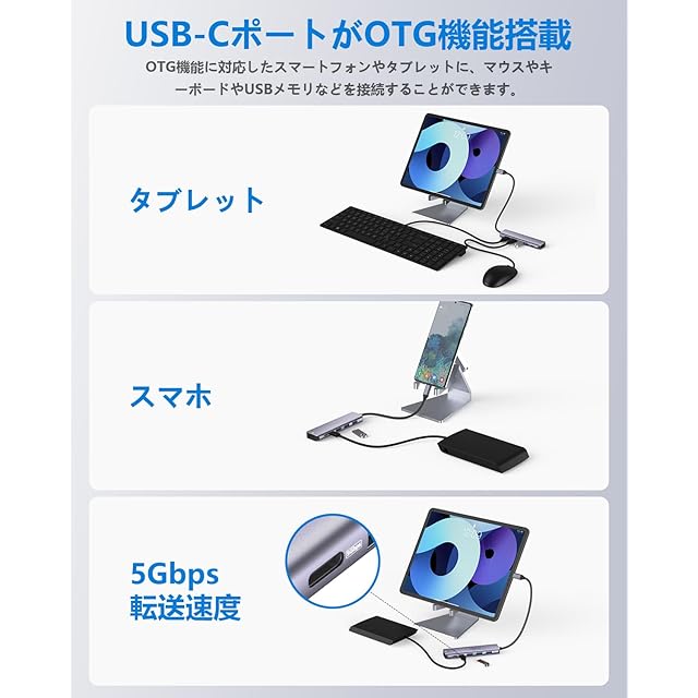 【usb type c ポート(OTG)データ転送機能搭載】本ドッキングステーション type cは従来品と違い、ハブにはtype c ポートが二つがあり、一つは PD充電用として設計され、もう一つはOTGデータ転送機能用として設計されています、伝送速度は5Gbpsであり、usbメモリなどをOTG機能に対応したスマートフォンやタブレットに接続することができる。ご注意:この機能は、OTG対応のスマホやタブレットにのみ対応しています。また、mac hubにはusb-Aポートが三つがあり、USB3.0ポートにより、キーボード、マウス、USBディスク、ハードディスクなどをMacBook Proに接続でき、5Gbpsの高速データ転送を実現して、数秒以内にHD映画を転送することが可能です。