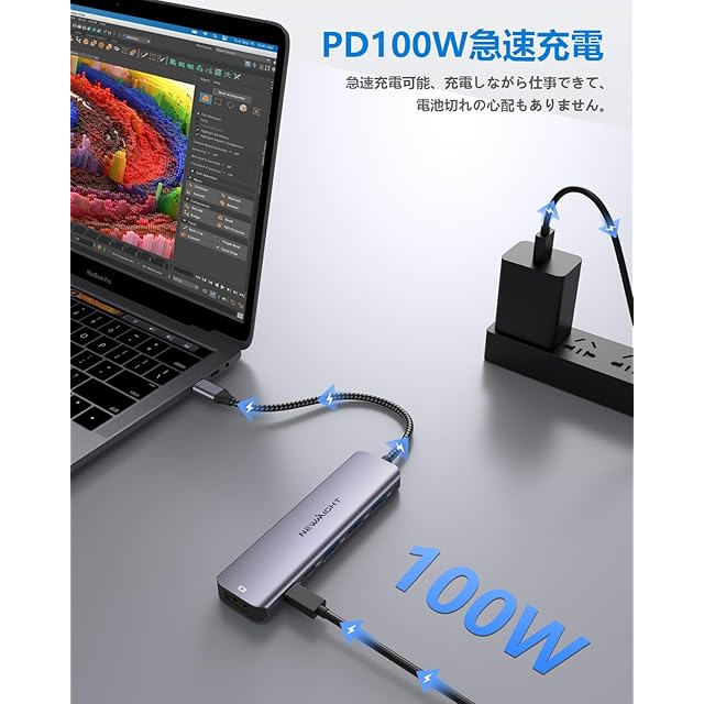 【100W PD急速充電】usb c hdmi 変換アダプタはアップグレードされた超スマートチップを搭載し、c型充電ポートはUSB-cに電力を供給するデバイスに100 Wまでの電源を転送し、USBポートに接続されたハードディスクドライブ、DVDドライブ、アクセサリに追加の電源を提供します。また、hdmi usb 変換 アダプタは充電しながらも、ハブの他の機能を同時に利用することが可能、充電しながら仕事できて、電池切れの心配もありません。非常に便利なmacbook ハブです。