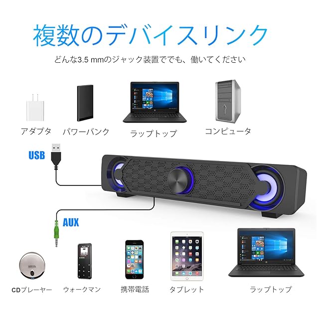 ♪『簡単な操作』:USBケーブルを電源に接続し、3.5mmオーディオケーブルをデバイス(PC /ノートブック/スマートフォンなど)のオーディオ出力に挿入します。次に、スイッチを回してサウンドバーをオンにします。回転ボタンを回して音量を調節します。サウンドバースピーカーの音量を簡単にコントロールできます。