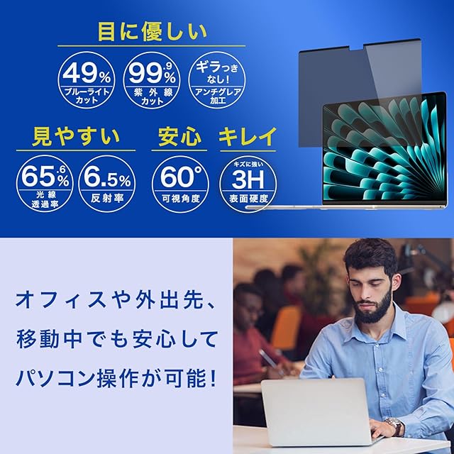 ✅ 【ブルーライトカット&反射軽減】プライバシーフィルターはブルーライトカットとUVプロテクションの機能を備えています。 ご利用になる方のプライバシーを保護するだけでなく、紫外線は99%、ブルーライトカットは49%カットするので、大切な目を守ることができます。 アスクリーンコーティングによって透過率は65%を維持しつつ、スクリーンを傷や汚れからしっかり保護します。