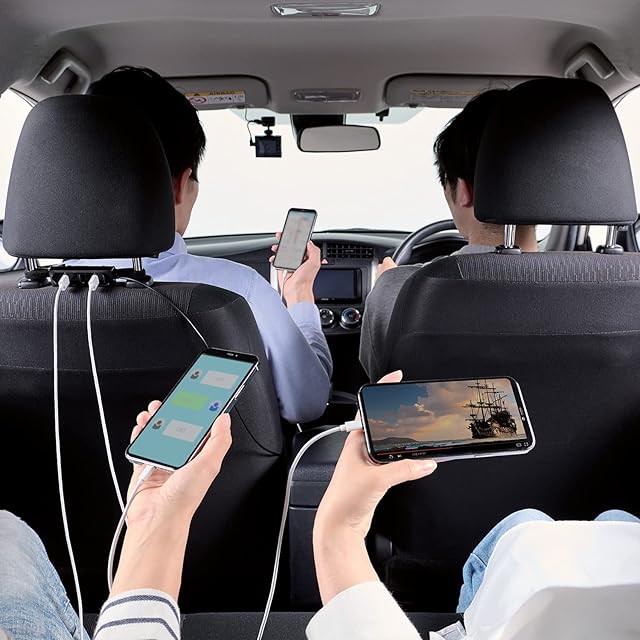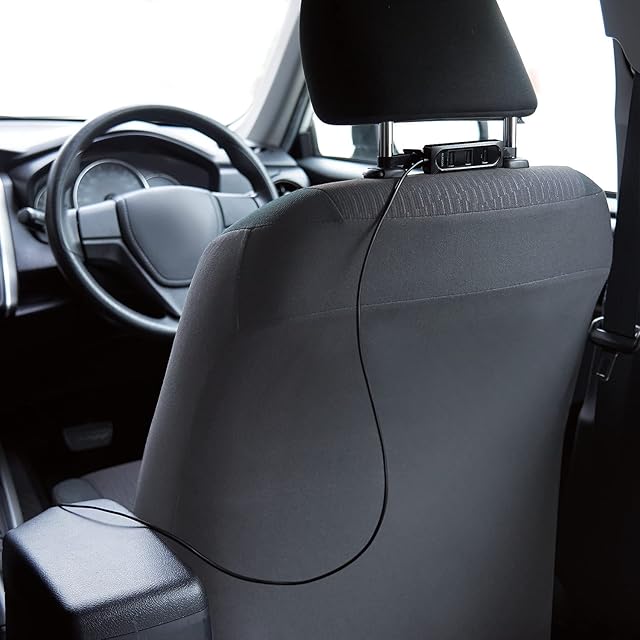 付属のベルトを使って、製品本体をヘッドレストに固定出来ます。また、製品本体背面にクリップがあるので、シートのポケットに差し込んで固定することもできます。