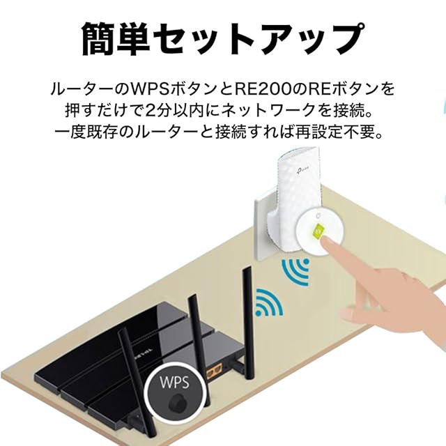 ルーターのWPSボタンとRE200のレンジエクステンダーボタンを押すだけで、2分以内にネットワークに接続することができます。