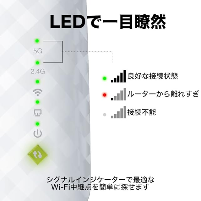 [LEDでサポート] ルーターからの電波状況をLEDランプで確認できるので、最適な設置場所を探すのに役立ちます。