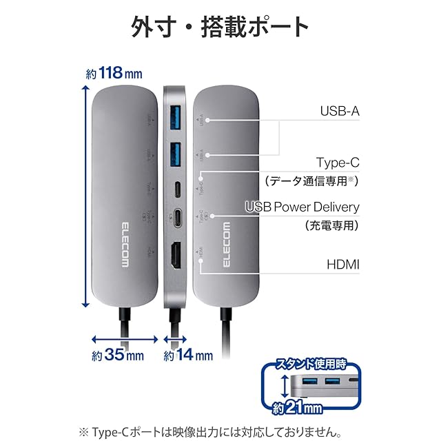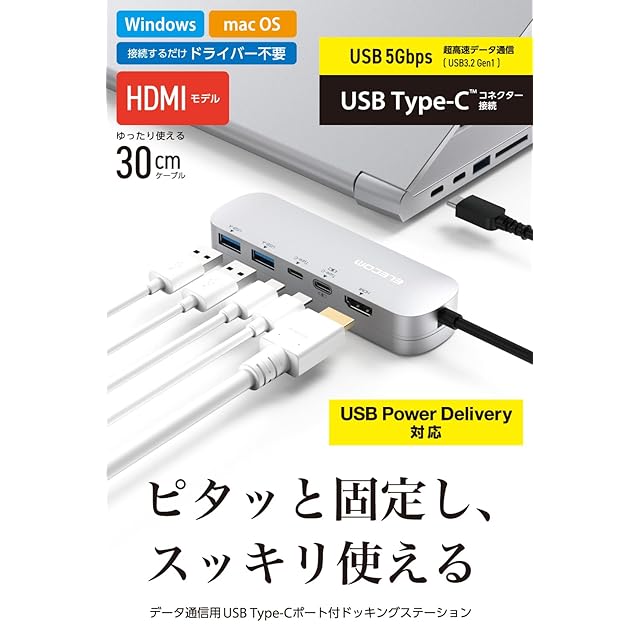 エレコム USB Type-C ハブ ドッキングステーション 5-in-1 固定用スタンド付 PD対応 100W USB3.1 Gen1×2ポート HDMI×1ポート USB-C×2 シルバー DST-C19SV/EC | つむぎ屋