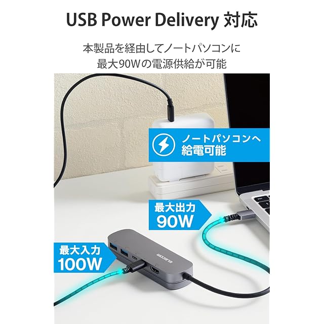 USB Type-C(TM)コネクターを経由して最大100W(※)の電力をデバイス/パソコン本体に供給するUSB Power Deliveryに対応しています。