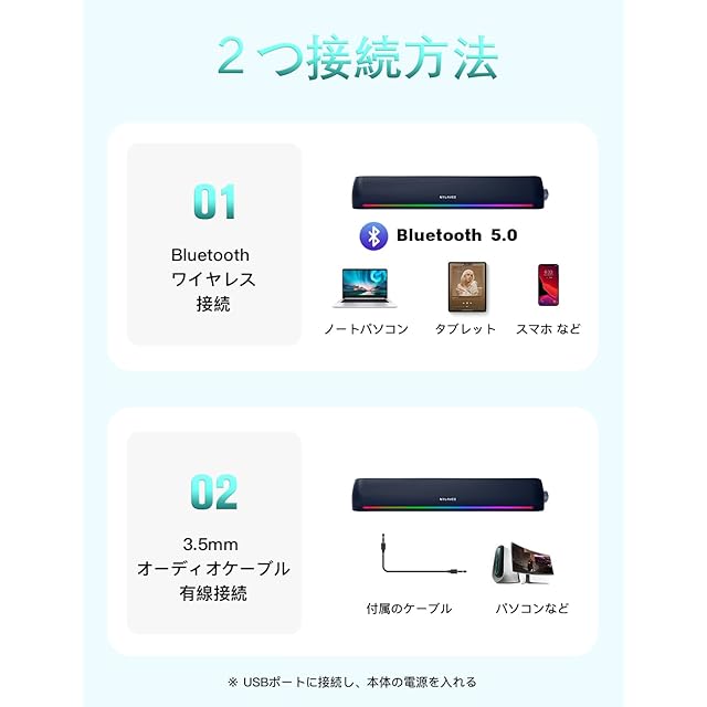 【2つの接続方法】 Nylavee PCスピーカーには、Bluetoothと3.5mmオーディオケーブルの2つ接続方法があります。ノートパソコン、デスクトップ、PC、携帯電話、タブレット、PS4など幅広いデバイスと互換性があります。