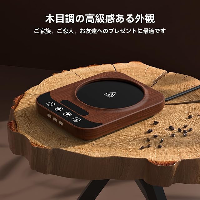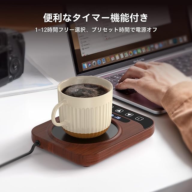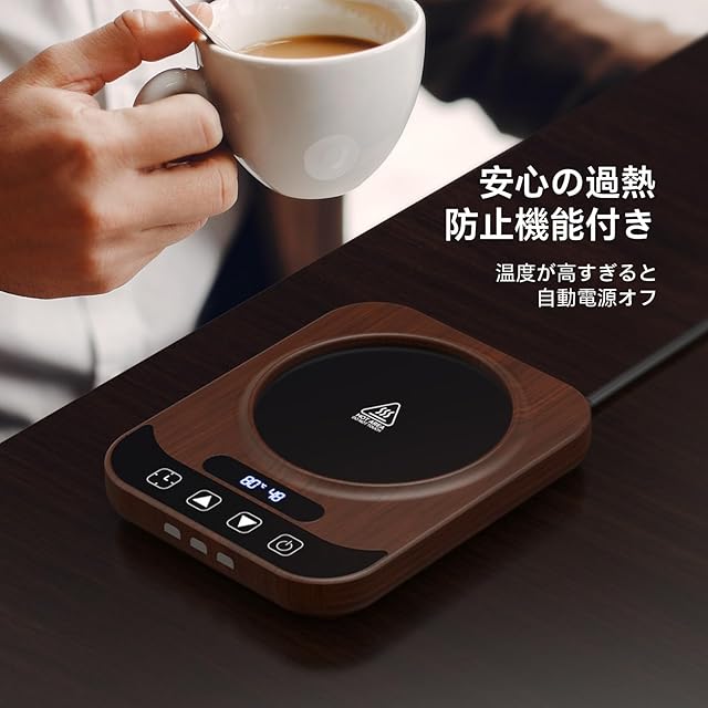【9段階温度調節】こちらの商品は、9段階の温度設定が可能なカップウォーマーです。40℃から80℃までの範囲でお好みの温度を選べるため、飲み物を常に最適な温度に保つことができます。寒い季節や長時間の仕事中でも、最後まで暖かい飲み物を楽しめるのが特徴です。