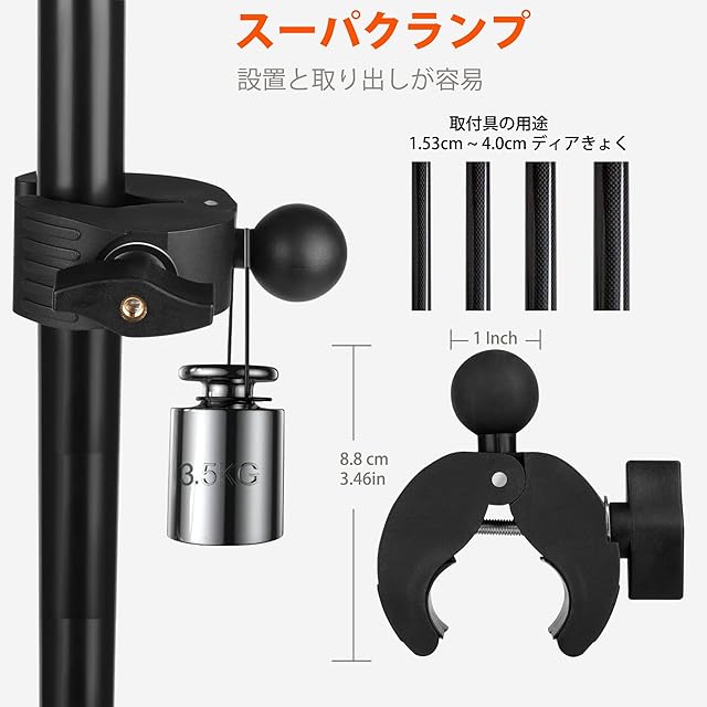 【スーパーバインダー】-スーパーバインダーは、マイクスタンド、ハンガー、音楽スタンドの上部ポールなど、使用可能なあらゆるポールに迅速かつ強固に接続できます。開口寸法は1.53 cm/0.6から4.0 cm/1.57まで