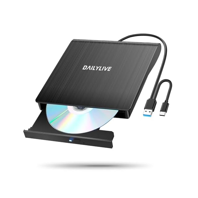 DAILYLIVE 外付けDVDドライブ CD DVDドライブ USB3.0&Type-C両用ケーブル 外付けDVD/CDドライブ Window/Linux/Mac OS対応 静音 軽量 読み出し&書き込み エラー校正 TYPE-Cコネクター付き 日本語取扱説明書付き