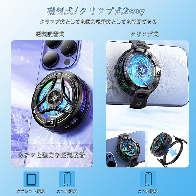 スマホ 冷却ファン 【2025年最新LED温度表示】 磁気式/クリップ式2way ペルチェ素子 Androidスマホクーラー Phoneスマホクーラー USB給電式 プラグアンドプレイ スマホ熱対策 小型 軽量 静音設計 ゲーム/ライブ/写真撮影/動画視聴/テレワーク時に対応 ブラック