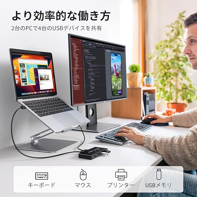 USB 切替器 PC4台用:1組のプリンタ、マウス、キーボード、外付けハードディスク、ハブなどのUSB機器を2台のパソコンで共有できる切替器です。ノートパソコンでもデスクトップパソコンでも対応しており、ボタン一つで簡単に切り替えることができます。