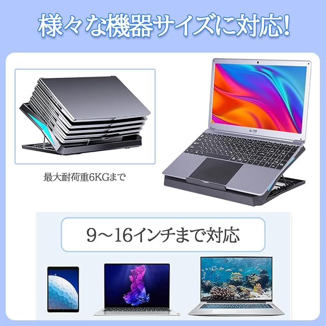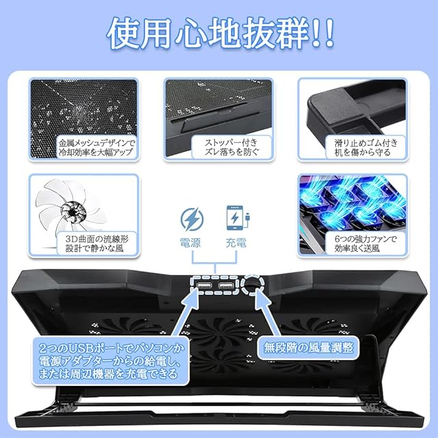 商品名:GMJ ノートパソコン冷却パッド 冷却台 冷却ファン【6機搭載】 6段階高度調整 風量調節 ノートPCクーラー 大風量 低騒音 メタルメッシュデザイン 滑り止め付き ledストリップライト付 9-17インチノートPC対応 / Macbook/Macbook Pro / PS3 / PS4等に対応 オフィス/在宅勤務/出張などに適用 日本語取扱書付