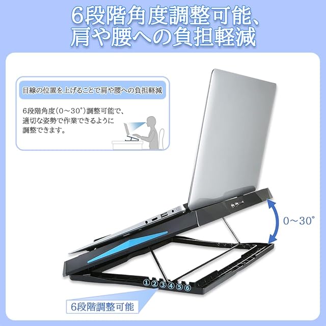 冷却パッドは人間工学に基づいた設計で、6段階の角度調整が可能です。パソコン用スタンドとしても使用でき、0°から30°までの角度で調整が可能です。この設計により、長時間作業しても首や頭の疲れを軽減し、快適な姿勢を保つことができます。 サイズは368*273*28mmであり 10〜16インチの様々なノートパソコンに対応可能です。2kg以上のノートパソコンでもしっかりと安定します。さらに、スリップ防止ゴムが付いており、ノートパソコンの滑り落ちや揺れを効果的に防ぎます。 画面の高さを調整できるため、正しい姿勢で作業ができ、肩や首の負担を軽減し、目の疲れを防ぎます。デスクワークが快適になるため、外出自粛期間でもストレスを減らせます!