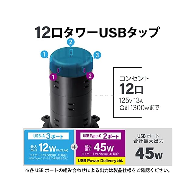 12個の差込口と2個のUSB Type-C(TM)(USB-C(TM))ポート、3個のUSB-Aポートを備えたタワー形状のUSBタップです。