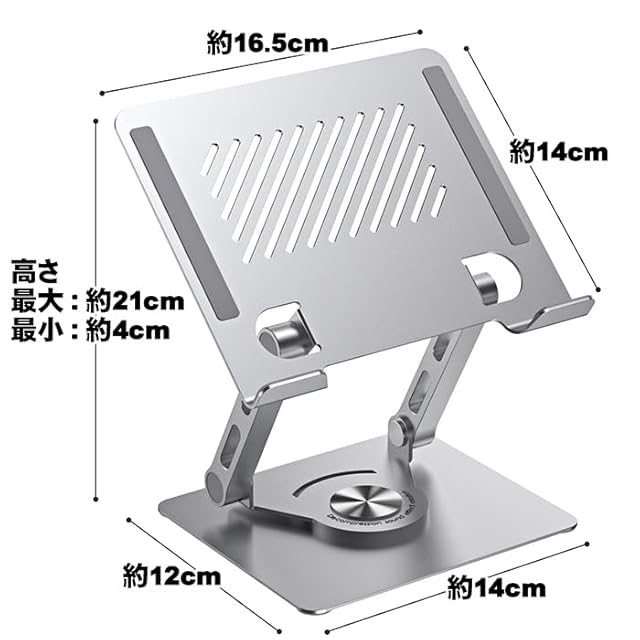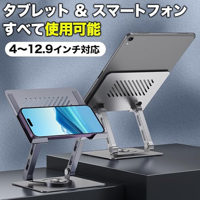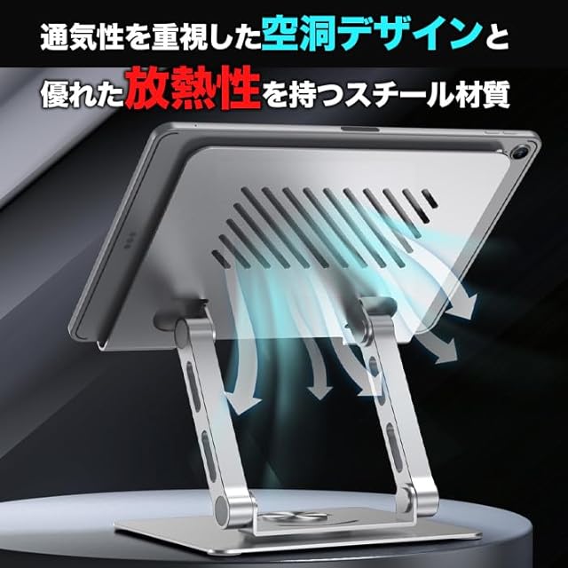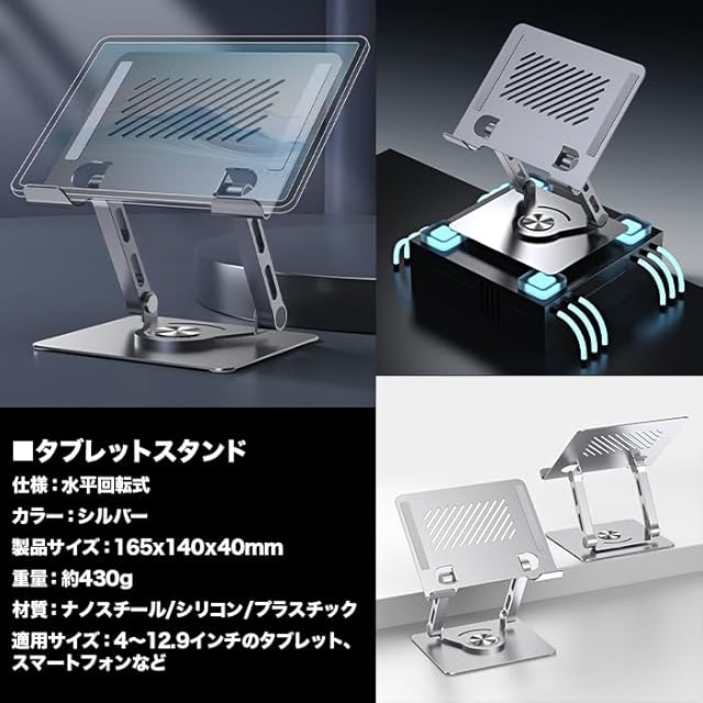 商品 タブレットスタンド<br> サイズ 16.5 x 14 x 4.0(cm)<br> 重量 約430g<br> 素材 ナノスチール、シリコン、プラスチック<br> 調整可能な高さ 40mm~210mm<br> 対応可能 あらゆるタブレットやスマートフォンなどの12.9インチまでのサイズを幅広く対応可能です。<br> 特徴 【高度40mm~210mm 調節自由】高さと傾斜角度をお好みに調整でき、姿勢の改善に役たつ、首、肩、背中などへの負担が軽減され、より快適な生活を楽しめます。 <br> <br> 【放熱効果抜群合金素材】本体は肉厚のスチールで出来上がり、放熱効果抜群。軽量かつ高強度で耐衝撃性が良い、曲がり変形しにくい、安定しています。<br> <br> 【滑り止め・保護パッド】低重心により、PCスタンドの底部と両側と爪の内側とにはシリコーン製のパッドが付いて、滑り止めだけでなく、大事なパソコンを傷つけるようなことを防止できます。<br> <br> 【折りたたみ式・収納スペースに困りません】折りたたみ可能な仕様で、収納スペースに困りません。持ち運びにも便利でどこでも便利に使えます。<br> <br> 【期間】1年間<br> 画像のタブレット等は付属しておりません。スタンドのみの販売となります。
