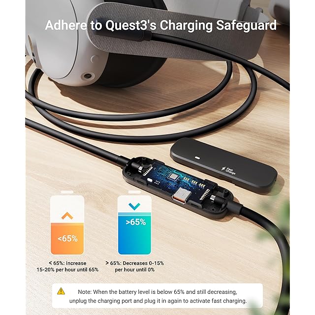 安全な充電:Syntechの充電リンクケーブルはQuest3/2の充電プロトコルに準拠し、第二世代の安全チップを採用してバッテリーレベルと充電電力をバランスします。それは電流を安全な範囲に保ち、バッテリーの寿命を損なわないようにします。したがって、Quest3の容量が65%を超えると、充電電力が減少する可能性があります。注記:高電力の他の充電器を使用すると、「液体または異物が検出されました」と間違って警報される可能性があるため、Quest3S/3は公式の充電器で充電してください。