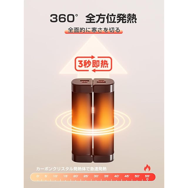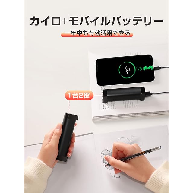 √【40~55℃の3段階温度調節】通勤・通学時には高めの55℃、デスクワーク中は低めの45℃に設定するなど、シーンに合わせて最適な温度で快適に暖まれます。冬の旅行にもぴったりで、ホテルから観光先まで、状況に応じて温度を調整できて便利です。 √【急速発熱】熱伝導性に優れた素材を使用し、電源を入れるとすぐに暖かさを感じられるので、寒い季節でも待つことなく快適です。 √【恒温発熱】最新のMCUチップとサーモスタットを搭載し、急速発熱と同時に恒温機能も備えています。一定の温度を維持し、過度な温度変化を防ぐため、安全に使用できます。 √【360°全方位発熱】他社製品の両面発熱とは異なり、電気カイロは円筒型の設計により、360°全方向に均一に発熱し、冬の寒さをしっかりとカバーします。 √【モバイルバッテリー機能】カイロとしてだけでなく、10,000mAhの大容量バッテリーとしてiPhoneやワイヤレスイヤホンなど2台同時に充電可能な便利な1台2役です。 √【持ち運び便利】1個あたりわずか119gと軽量で、女性やお子様にもストレスなく握りやすく、ポケットに入れて簡単に持ち運べます。 √【エコ&節約】繰り返し使える充電式カイロで、使い捨てゴミを出さず環境にも優しく、経済的です。 √【万全の保護機能】過充電保護・過熱保護・短絡保護・漏電防止・爆発防止といった安全機能が充実し、PSE認証も取得済みです。 √【ギフトにも最適】高級感のある9色の中から選べるシンプルでおしゃれなデザインは、ギフトやプレゼントにも最適です。