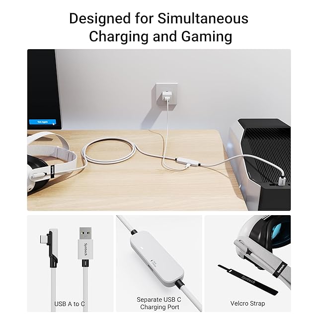 Syntech リンクケーブル 3M 充電付き、Meta Quest 3S/Quest 3/Quest 2/Pico 4 に対応、別の充電ポート付き VR リンクケーブル、USB 3.0 から Type C コード ライト PC/SteamVR 用
