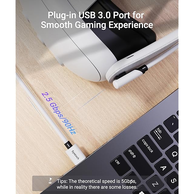 最適なリンクパフォーマンス:Syntechの充電ケーブルはプラグアンドプレイであり、特定の手順を要しません。加えて、USB 3.0/2.5 Gbpsの転送速度をサポートしており、素晴らしいゲーミング体験を提供します。調整可能なベロクロストラップでケーブルをQuest3S/3/2に固定し、動いている時の切断を防ぎます。(注記:コンピューター接続の場合は、ケーブルをUSB A 3.1/3.0ポートに挿入してください)